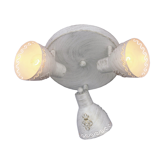 Каркас изготовлен из металла белого цвета с золотой патиной, плафон также из металла с ажурной окантовкой.