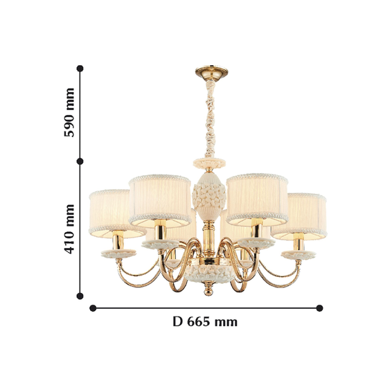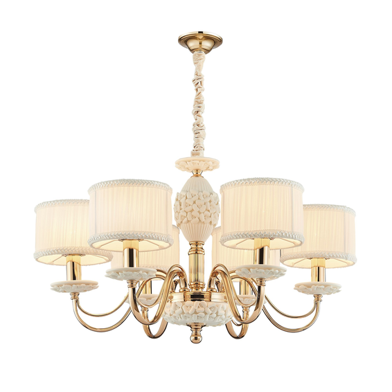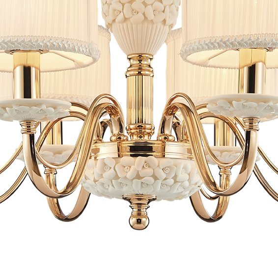 Каркас изготовлен из металла, покрытый золотом гальваническим способом, декоративные элементы из керамики бежевого цвета с белыми керамическими цветами и подвесками, абажуры из пыльно-розовой ткани.