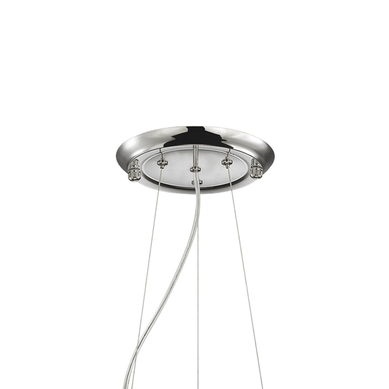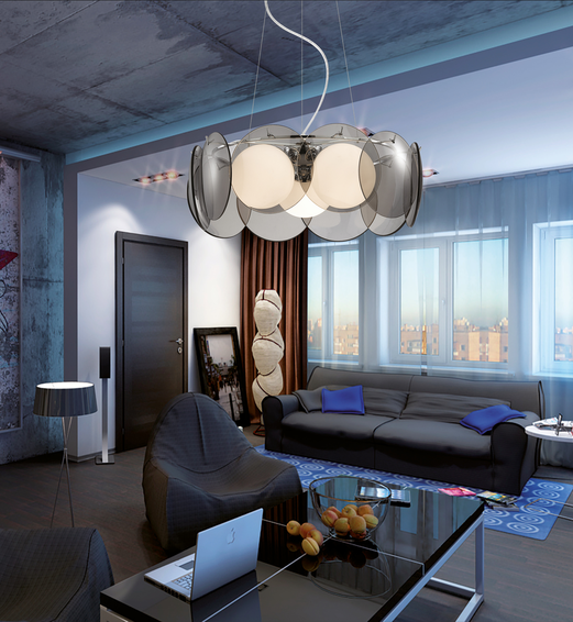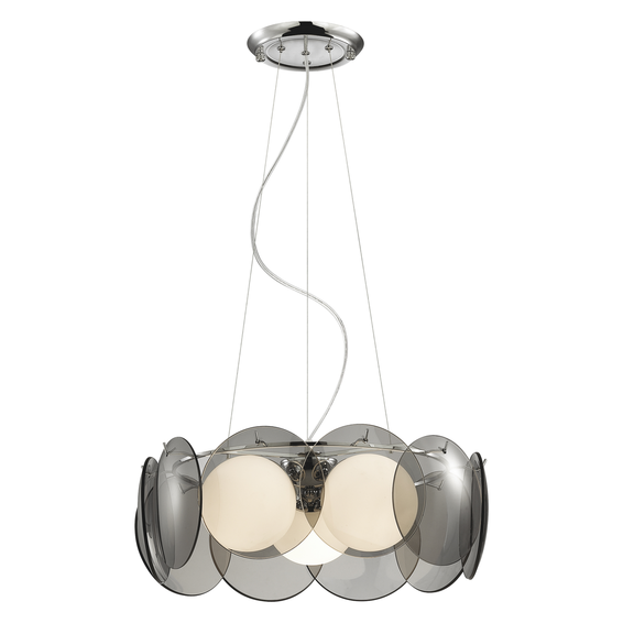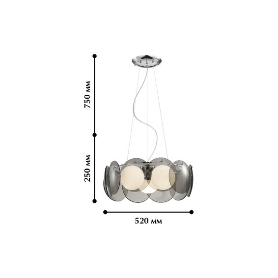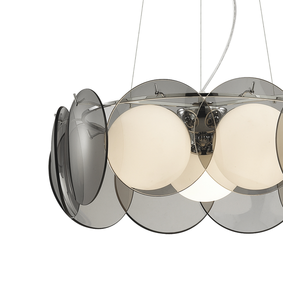 Арматура из металла с хромированным покрытием.Выдувные стеклянные шары + стеклянные круглые панели дымчатого цвета.