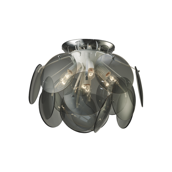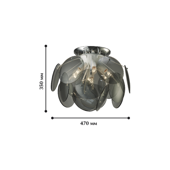 Арматура из металла с хромированным покрытием.Выдувные стеклянные шары + стеклянные круглые панели дымчатого цвета.