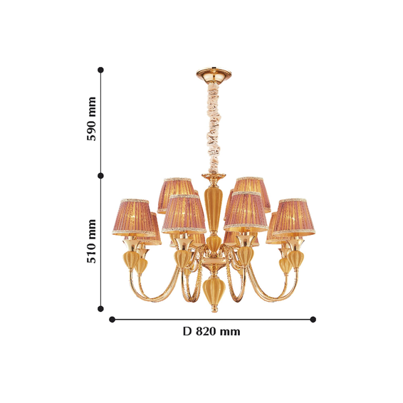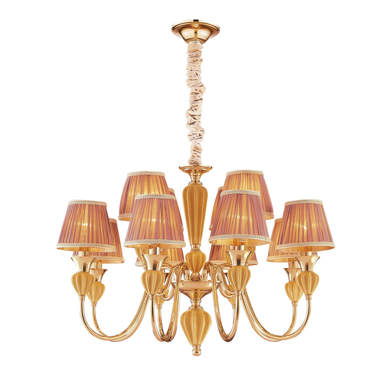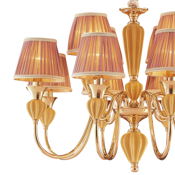 Каркас изготовлен из металла, покрытый золотом гальваническим способом, декоративные элементы из керамики янтарного цвета, абажуры из бежевой ткани.