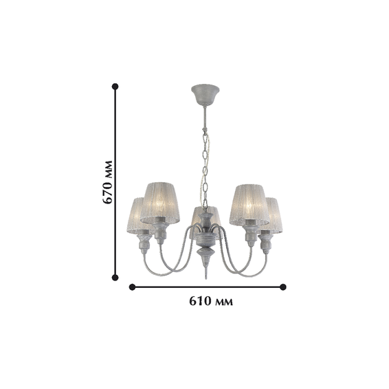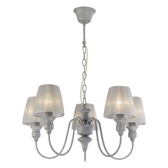 Коллекция MIRAGE выполнена в редком скандинавском сером цвете с белой патиной,основа из металла. Цвет ткани абажуров подобран в тон каркасу - нежно-серая органза.