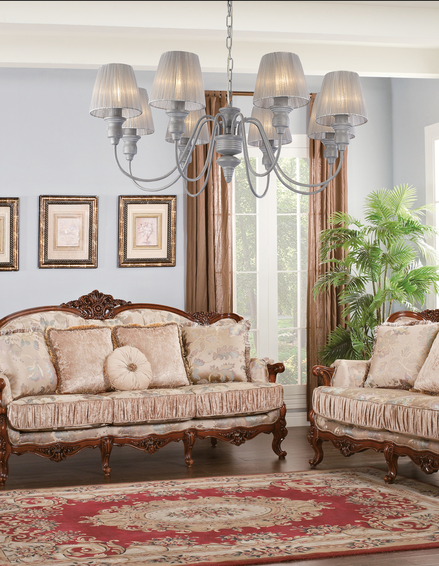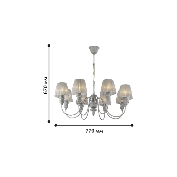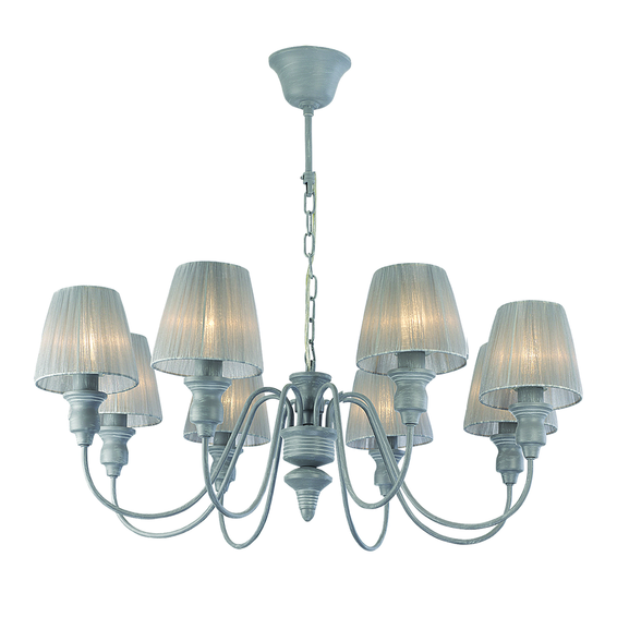 Коллекция MIRAGE выполнена в редком скандинавском сером цвете с белой патиной,основа из металла. Цвет ткани абажуров подобран в тон каркасу - нежно-серая органза.