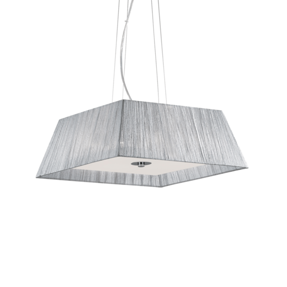 Арматура из хромированного металла. Абажуры из органзы с металлическим оттенком. Подвесы снабжены стальными тросиками регулируемыми по длине. В квадратной арматуре нижняя часть закрыта матовым стеклом.