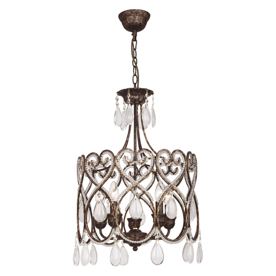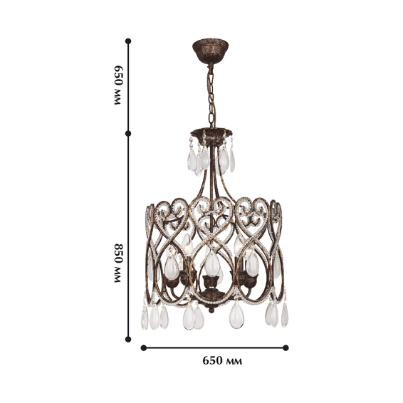 Каркас из металла ,черного цвета с золотой патиной, подвески из прозрачного хрусталя, с стеклянными декоративными каплями.