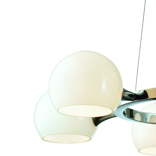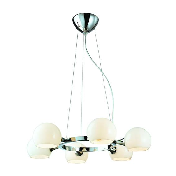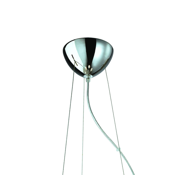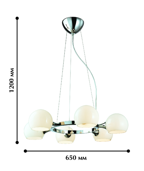 Арматура светильника сделана из металла,с хромированным покрытием.Крепежные тросы регулируются по высоте. Плафон выдувной дуплекс белый молочный.