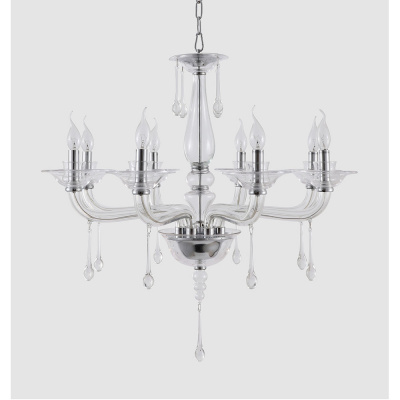 Арматура светильника сделана из металла,с хромированным покрытием.Корпус и подвесные детали из прозрачного стекла.