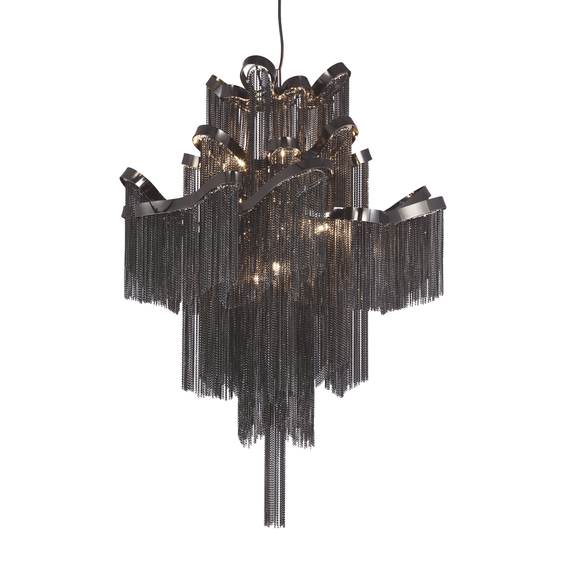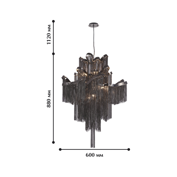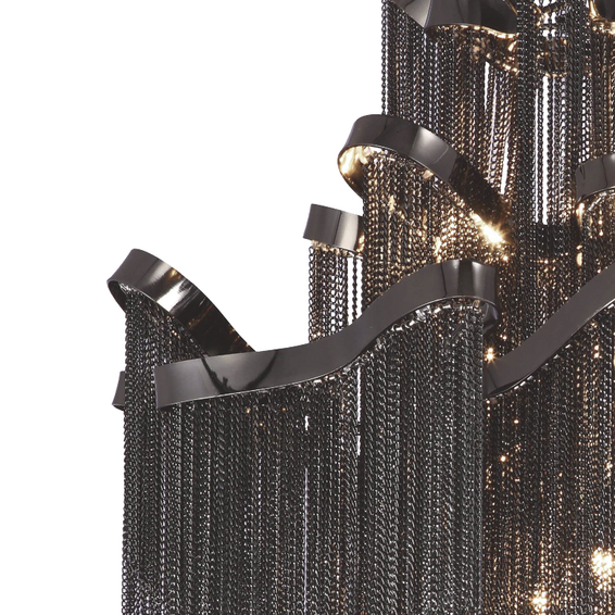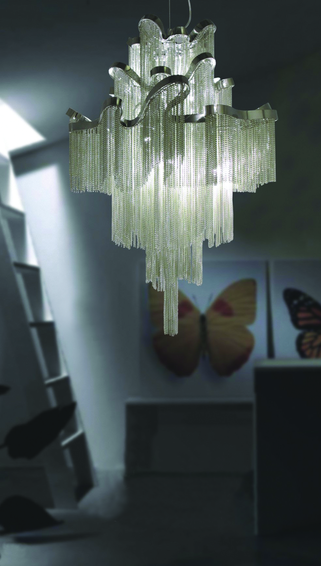 Арматура и крепежные элементы выполнены из металла в хроме. Петли хромированной ленты несут на себе белые металлические цепочки, образующие волнистый каскад оригинального абажура.Доступен также в черном хроме код-1157-8P.