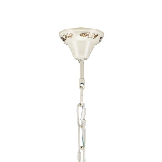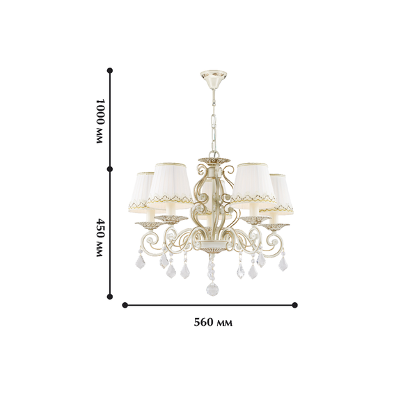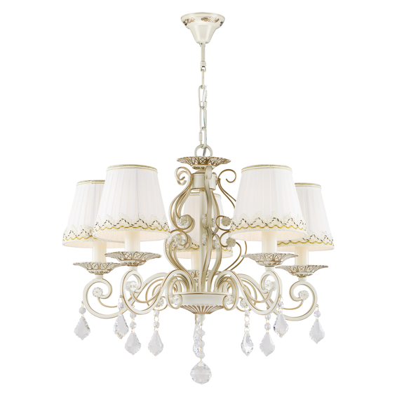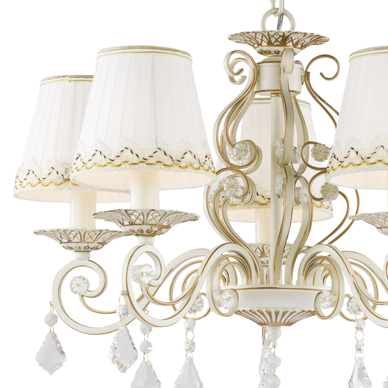 Каркас окрашен в цвет слоновой кости с позолотой, абажур из белой ткани украшен тесьмой с золотистым узором, хрустальные подвески высшего качества.