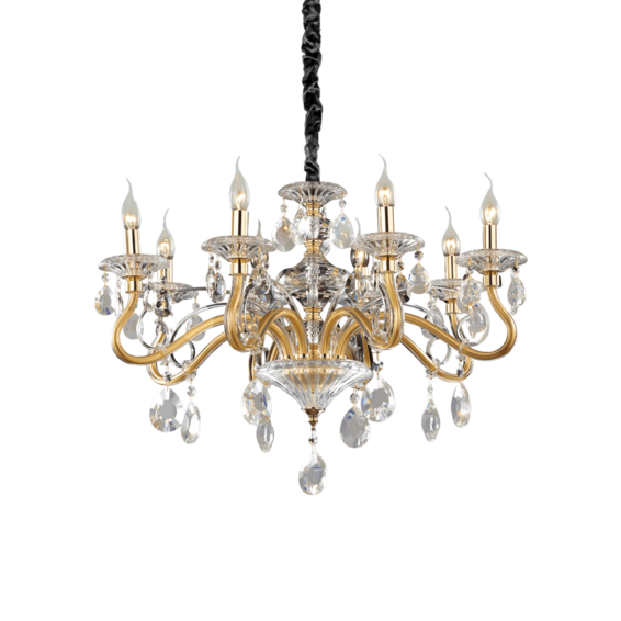 Арматура из хромированного или золотистого металла. Рожки из прозрачного дутого стекла с позолоченным покрытием в золотистой версии.