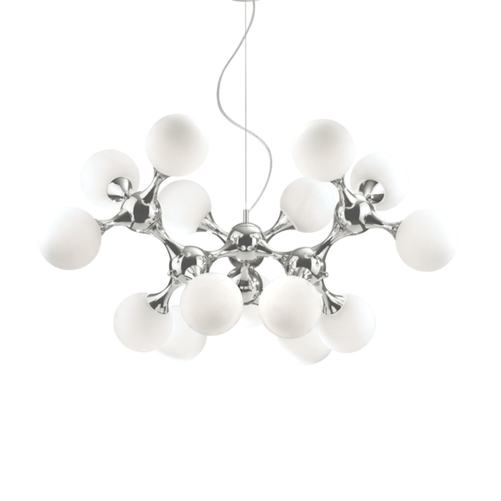 Арматура из хромированного металла. Элементы в соединении вращающие по вкусу. Рассеиватель из белого дутого матового стекла доступен в версиях: диаметр 60 см и диаметр 15 см.
