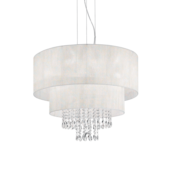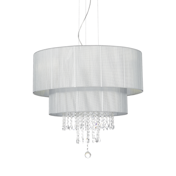 Арамтура в хроме. Рассеиватель из материала ПВХ с металлическим оттенком и нитями. Подвески из хрусталя с фацетом. Подвесы с тросиками и регулируются по длине.