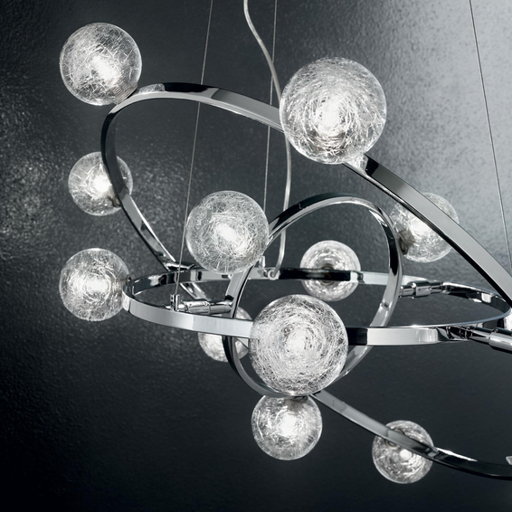 Арматура с хромовым покрытием состоит из вращающихся концентрических колец. Шарообразные рассеиватели с внутренними декорациями в виде алюминевой нити.