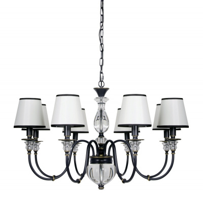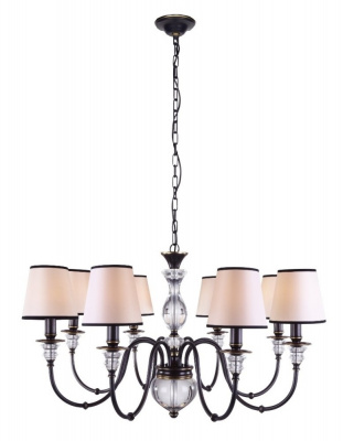 Каркас изготовлен из металла, окрашенного в цвет темная бронза. Абажуры из бежевого текстиля и хрустального стекла.