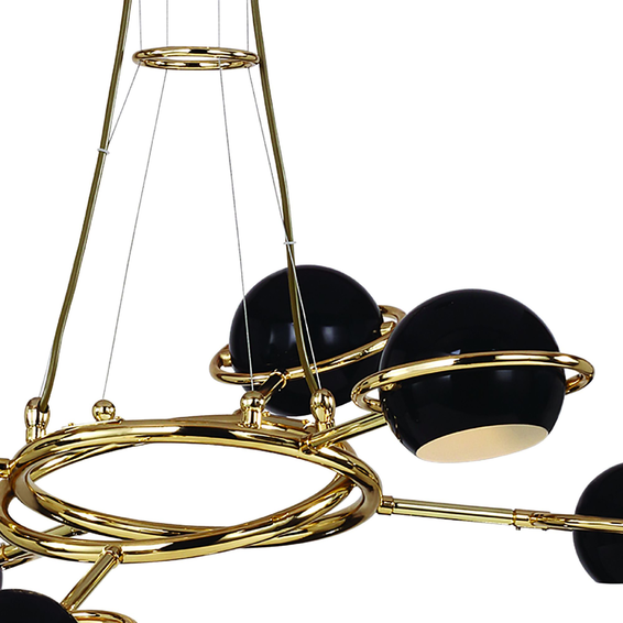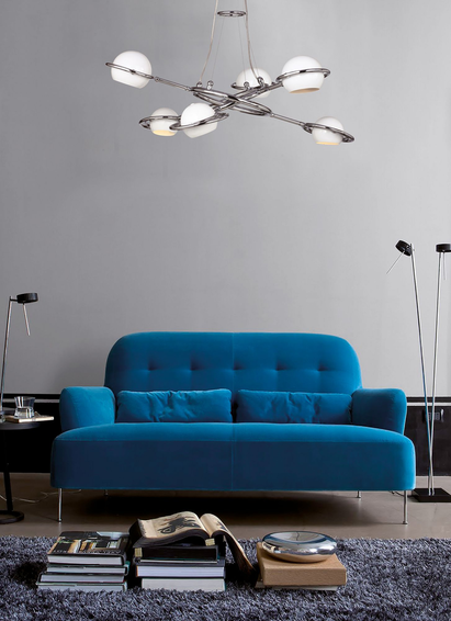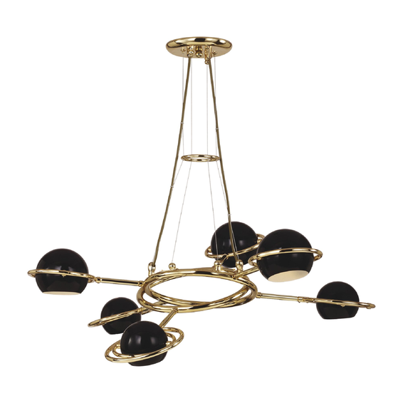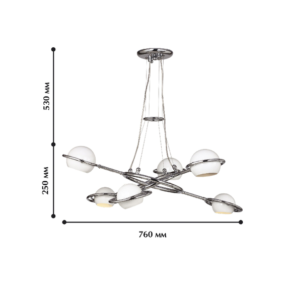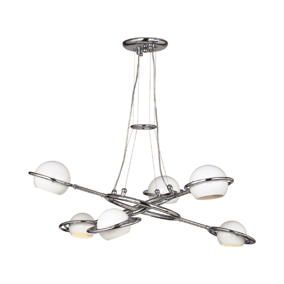 Каркас изготовлен из металла хромированного цвета, металлические плафоны белого цвета, можно менять конфигурацию светильника. Доступен с металлом золотого цвета и черными металлическими плафонами - PALLINO 1842-6P.