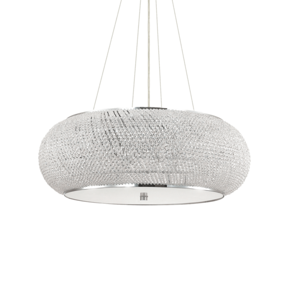 Арматура из металла. Рассеиватель состоит из нанизанных хрустальных бусинок с фацетом, нижняя часть закрыта круглообразным стеклом пескоструйной обработки. Стальные тросики регулируются по длине с помощью неподвижного устройства.