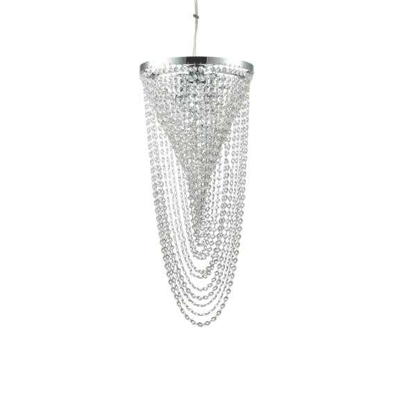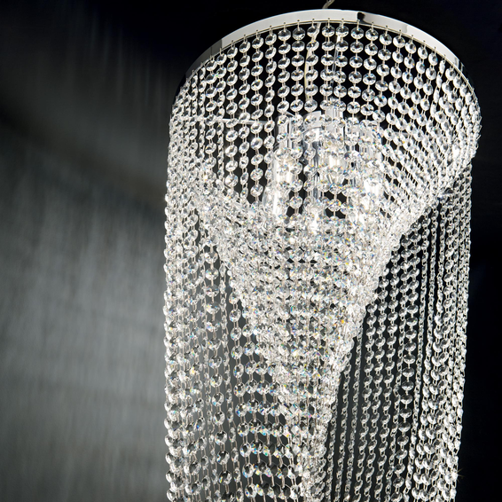 Потолочная чаша и арматура из хромированного металла. Декоративные элементы с цепочками восьмиугольников из хрусталя с фацетом.