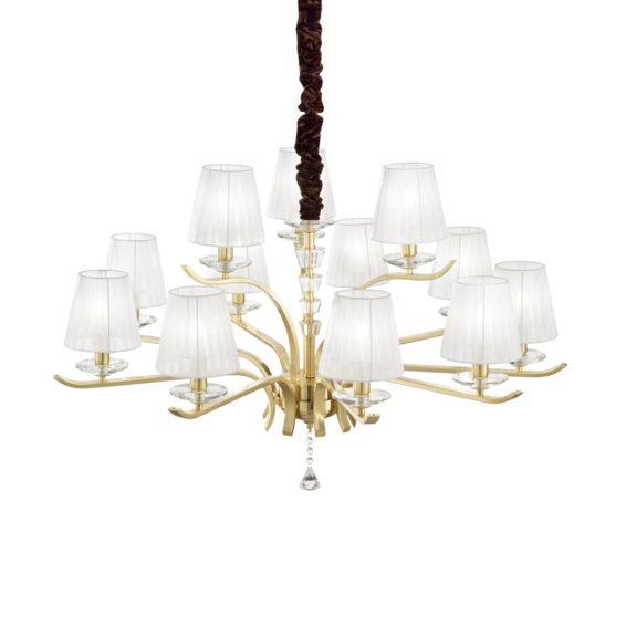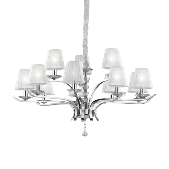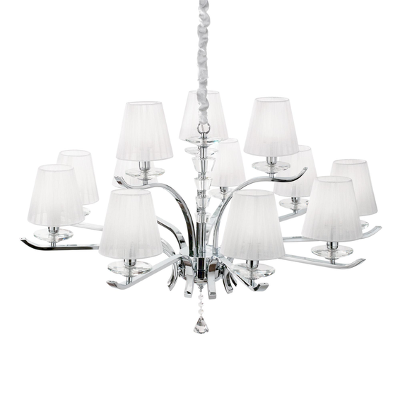 Арматура из металла. Центральный корпус, декоративные изделия и подвески из хрусталя с фацетом. Абажуры из органзы. Цепь скрыта бархатной тканью.