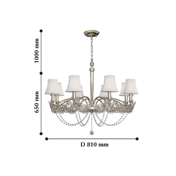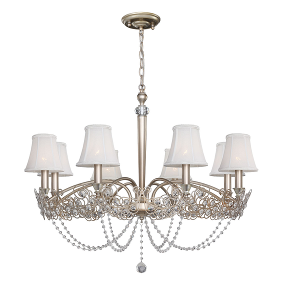 Каркас изготовлен из металла, окрашенного в цвет античное серебро, абажуры из белой ткани, хрустальные подвески высшего качества.