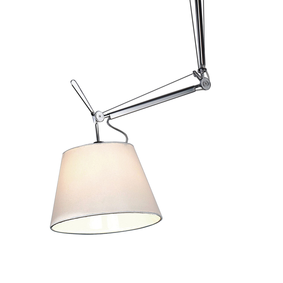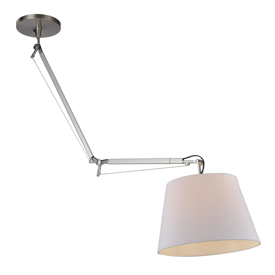 Каркас изготовлен из металла, окрашенного в серебряный цвет, абажур из белой ткани, трехступенчатая система сгибания основания.