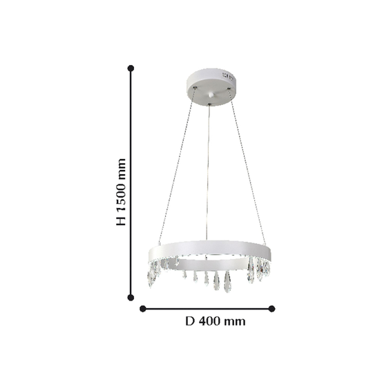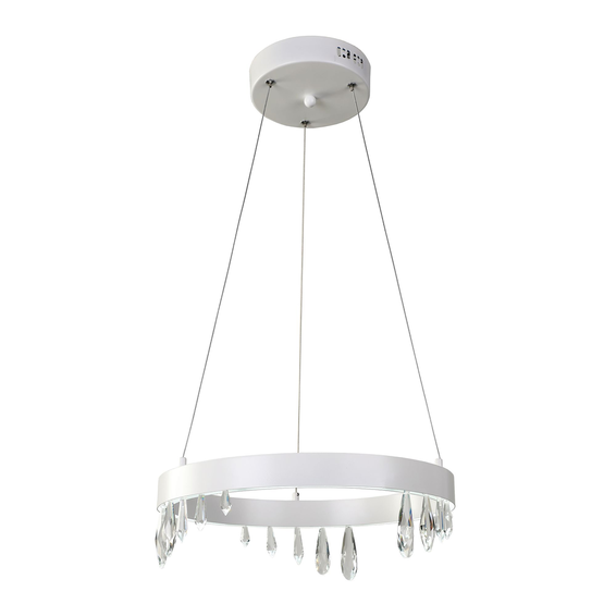 Корпус светильника и крепежные детали из металла белого цвета.Подвески из хрусталя разного размера и формы.