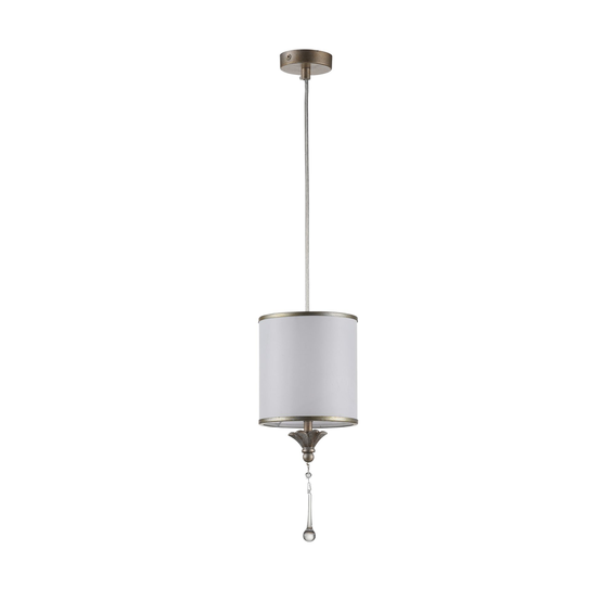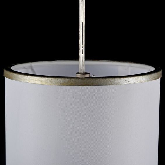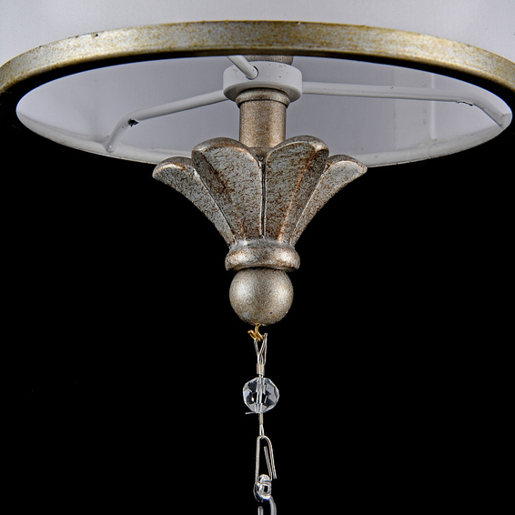 Круглый каркас из металла. Абажур из ПВХ покрыт белой тканью. Декоративные подвески.