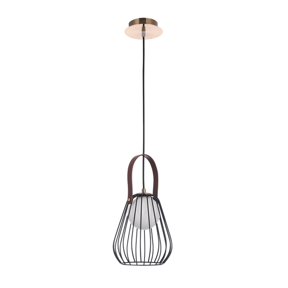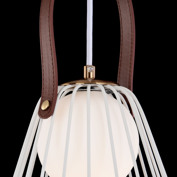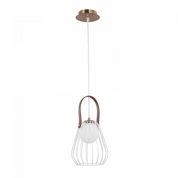 Арматура из металлических прутьев. Дополнена элементом в виде кожаного ремешка. Декоративный плафон из белого матового стекла. Модель представлена в 2-х цветах. Цвет Чёрный с Золотом - Артикул MOD544PL-01B
