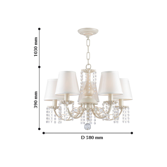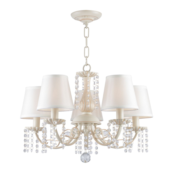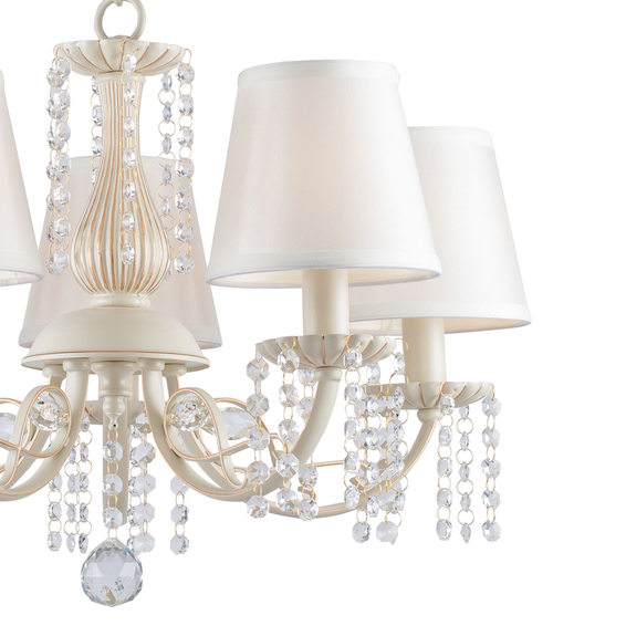 Каркас светильника из металла цвета слоновой кости с золотой патиной. Атласные абажуры дополняют подвески из хрусталя высшего качества.
