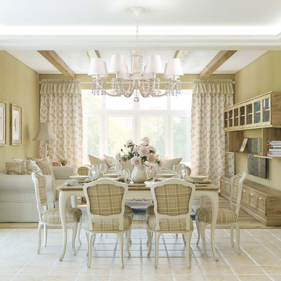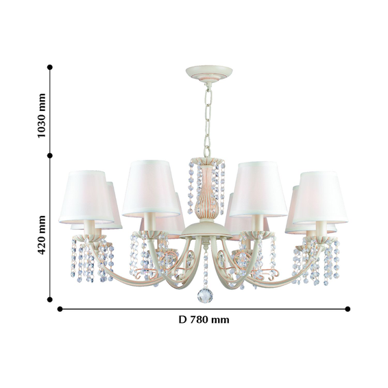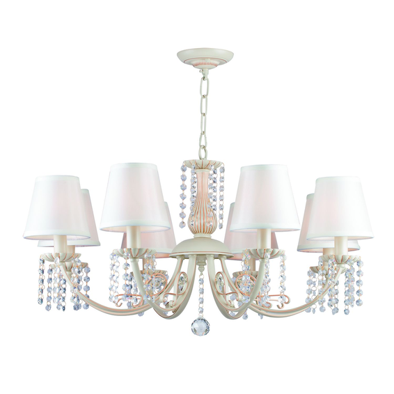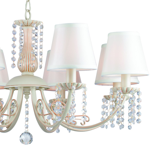 Каркас светильника из металла цвета слоновой кости с золотой патиной. Атласные абажуры дополняют подвески из хрусталя высшего качества.