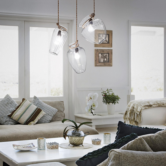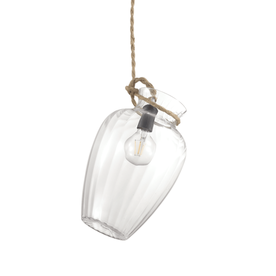 Потолочная чаша чёрной матовой краски. Провод покрыт шнуром. Рассеиватели со стеклянными прозрачными дутыми вазами.