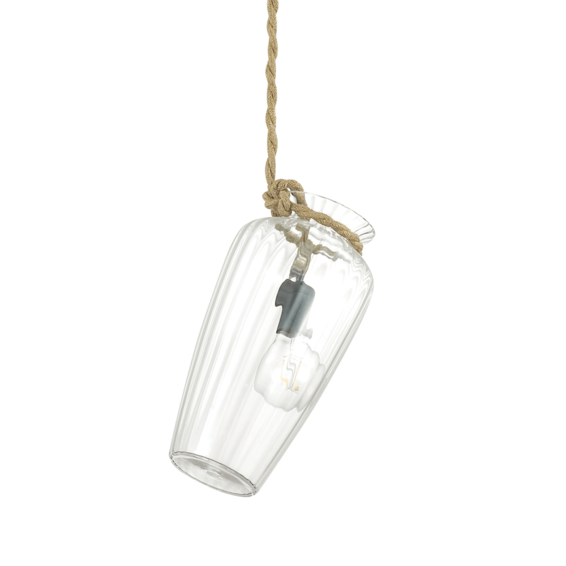 Потолочная чаша чёрной матовой краски. Провод покрыт шнуром. Рассеиватели со стеклянными прозрачными дутыми вазами.