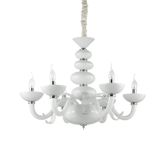 Люстра из белого дутого стекла ручной работы. Декоративные элементы из прозрачного стекла. Детали из хромированного металла. Цепь скрыта бархатной тканью.