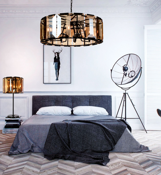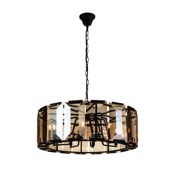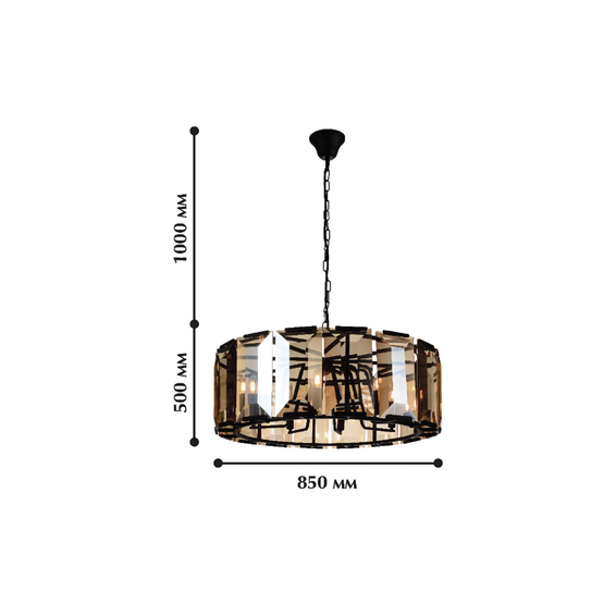 Арматура выполнена из металла, окрашенного в черный матовый цвет, стеклянные подвески с фацетом янтарного оттенка.