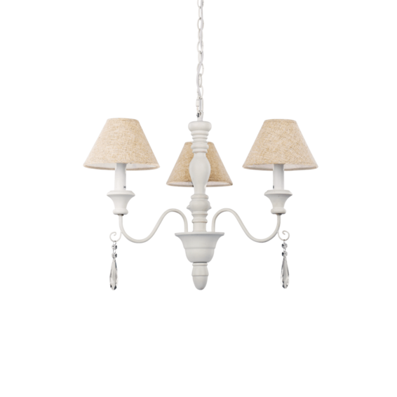 Корпус света из выточенного дерева, а рожки из металла. Матовая отделка. Абажуры из материала ПВХ покрыты тканью грубого плетения.