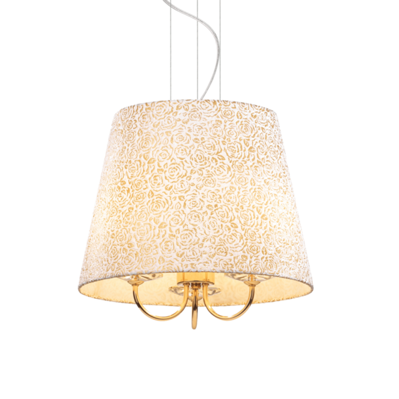 Арматура из металла с золотистым покрытием, основа и декоративные элементы из хрусталя фацетной огранки. Абажур из материала ПВХ обшитый тканью с вышитыми декорациями и золотистыми