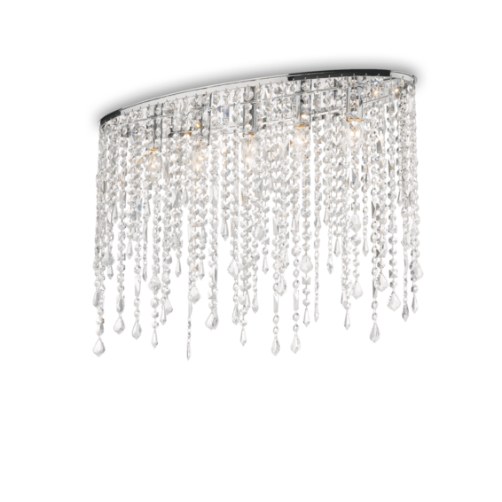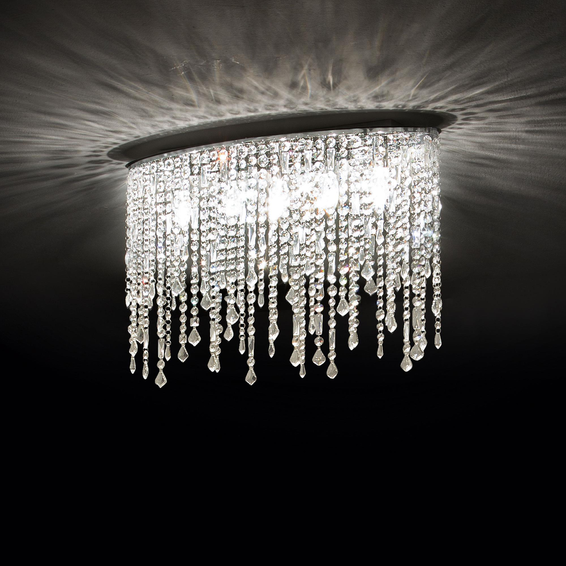 Овальная арматура из хромированного металла. Подвески из хрусталя с фацетом разных форм: восьмиугольные, квадратные, прямоугольные и капельные.