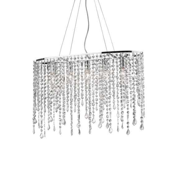 Овальная арматура из хромированного металла. Подвески из хрусталя с фацетом разных форм: восьмиугольные, квадратные, прямоугольные и капельные.