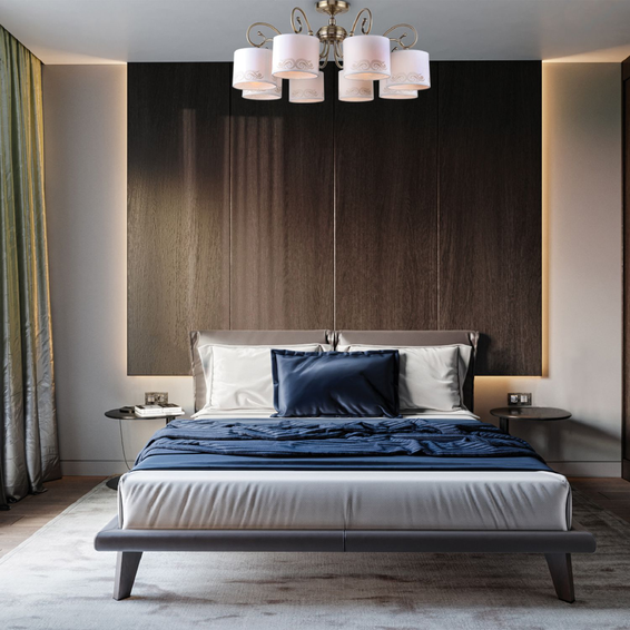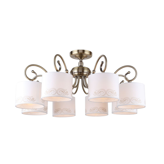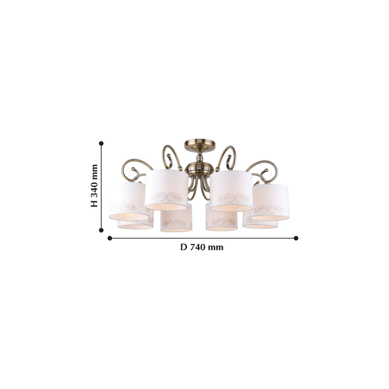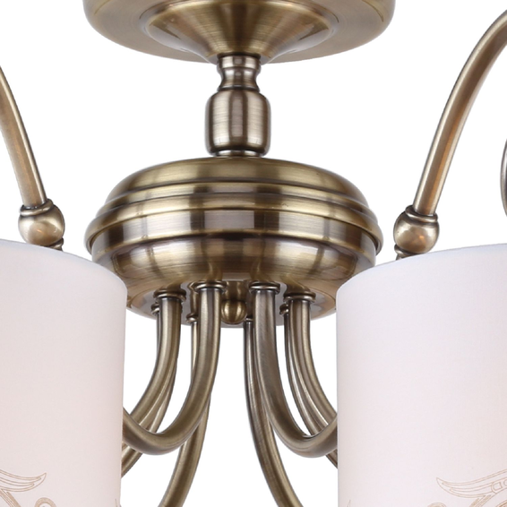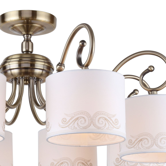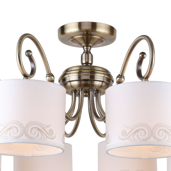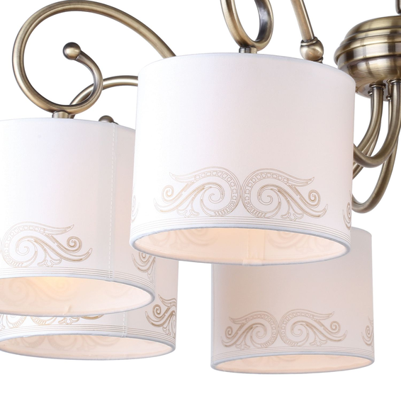 Каркас светильника из металла,в антично-бронзовом цвете,оформлен декоративными элементами из бронзы и тканевыми плафонами с классическим узором.