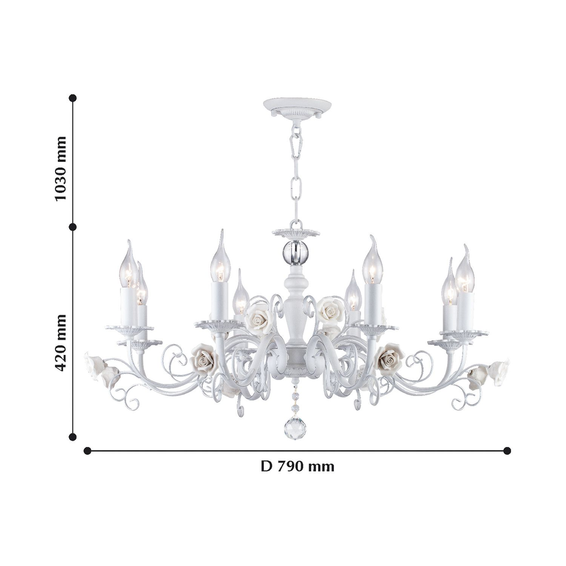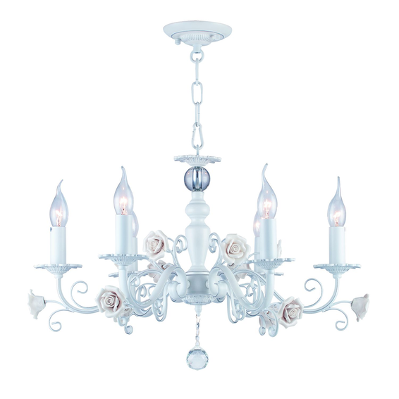 Каркас светильника сделан из металла белого матового цвета,покрыт серебрянной патиной.Фарфоровые розочки бнлого цвета с нежным кремовым оттенком.