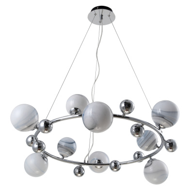Арматура светильника сделана из металла,покрытие хромированная гальваника.Плафоны из стекла,белые с цветными разводами.