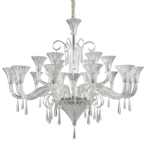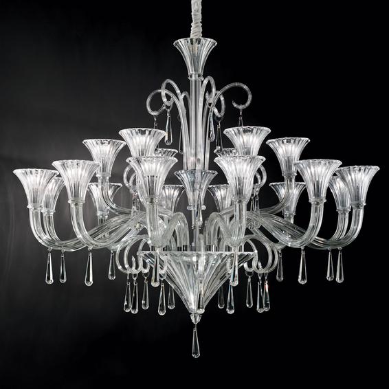 Люстра из прозрачного дутого стекла ручной работы. Детали из хромированного металла. Цепь скрыта бархатной тканью. Бра доступно также в золотистом покрытии с гранулированным стеклом.
