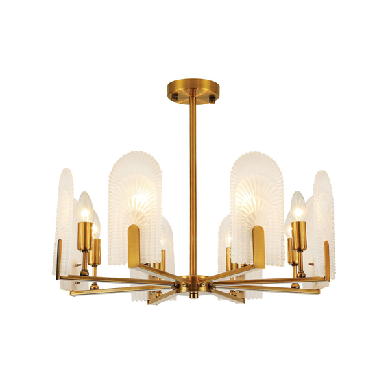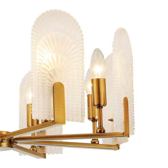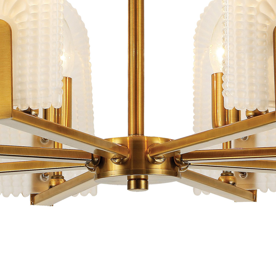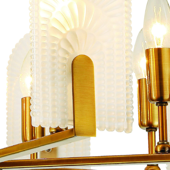 Каркас светильника изготовлен из металла, покрытого гальваническим способом в цвет латуни, стеклянные плафоны выполнены из узорного стекла, напоминающего многоярусные арки матового цвета.