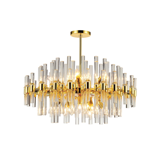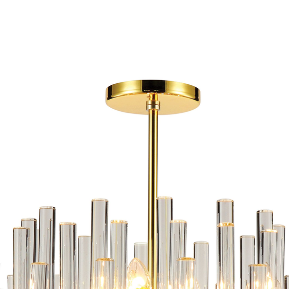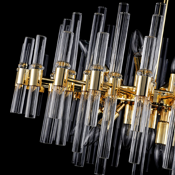 Металлический каркас золотого цвета, декор из стеклянных трубочек разной длины.