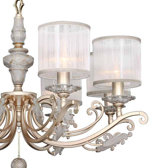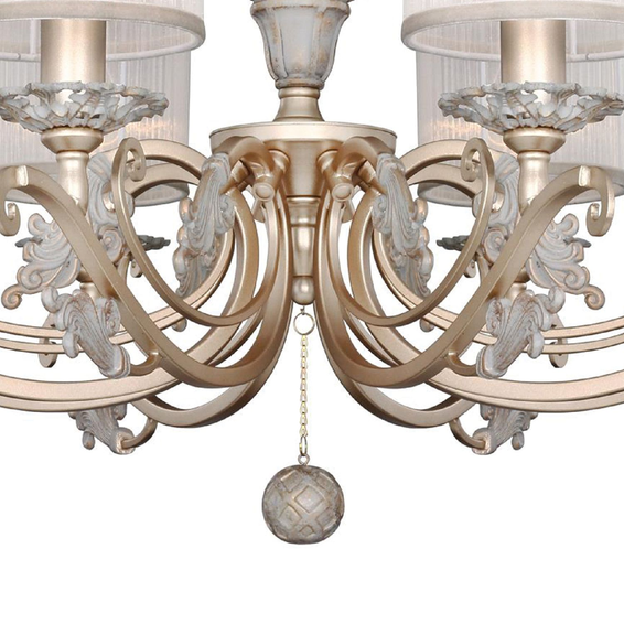 Каркас светильника из металла окрашен в золотистый цвет в сочетании с благородным серым с золотой патиной, тканевые абажуры из белой органзы.