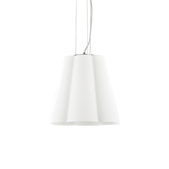 Арматура из хромированного металла. Рассеиватель из дутого белого матового стекла. Подвесы со стальными тросиками регулируемыми по длине c помощью автоматического устройства.