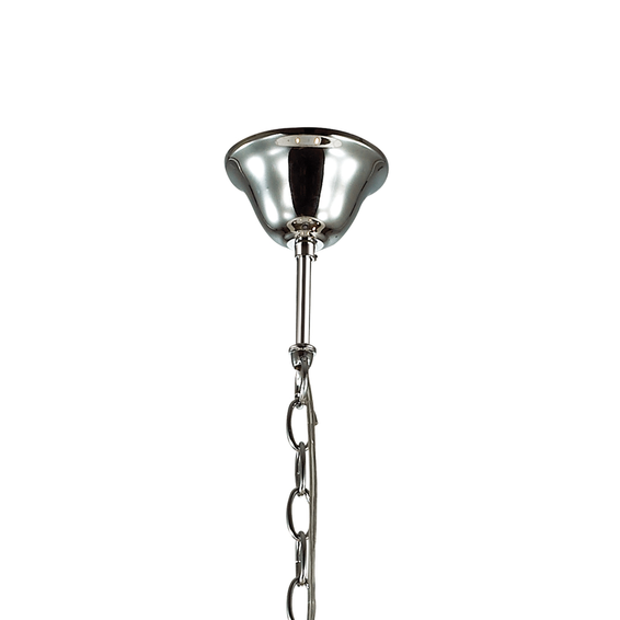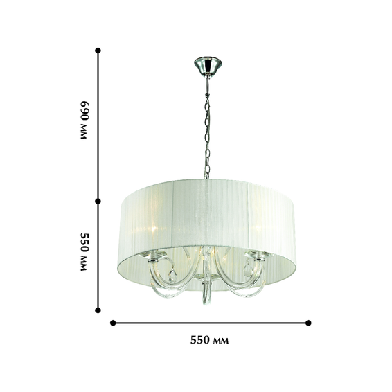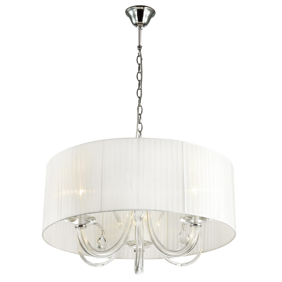 Арматура изготовлена из хромированного металла, рожки стеклянные, стекло выдувное, хрустальные подвески, плафон из белой органзы.