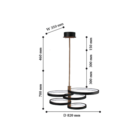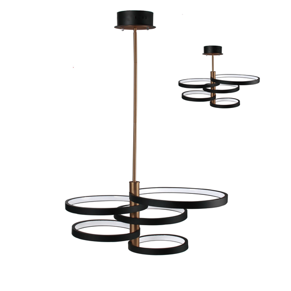 Каркас изготовлен из металл, окрашенного в черный цвет в сочетании с золотым, белый акриловый рассеиватель LED. Кольца могут вращаться вокруг центральной оси, регулируемая длина провода и струн.