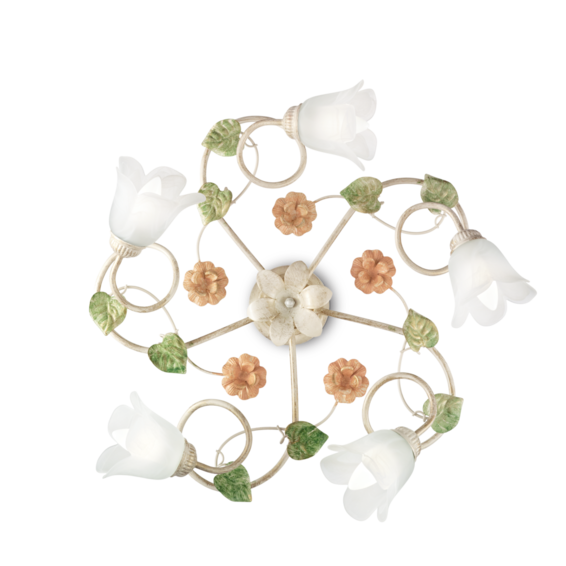 Арматура из металла ручной работы, окрашенная вручную в античном белом цвете с золотистыми отражениями, розовыми и зелёными элементами. Стекла матовые.