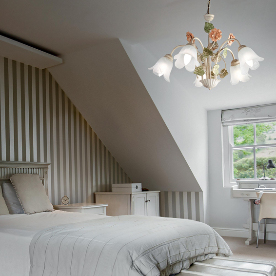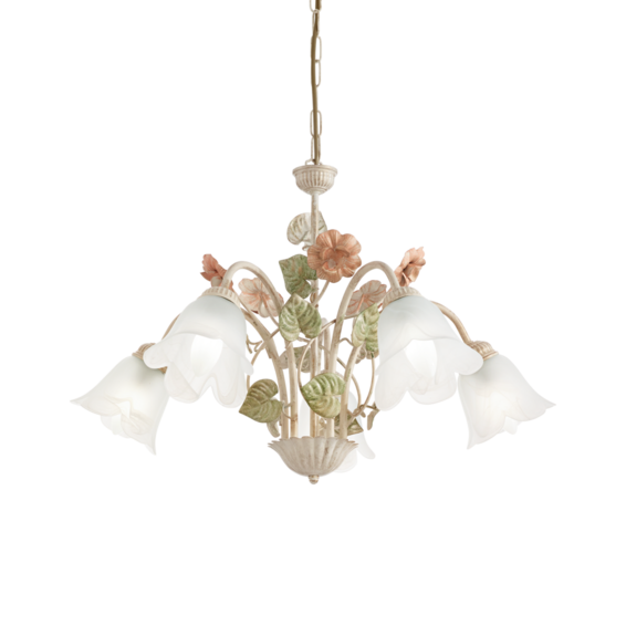 Арматура из металла ручной работы, окрашенная вручную в античном белом цвете с золотистыми отражениями, розовыми и зелёными элементами. Стекла матовые.