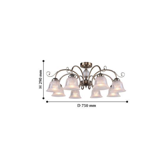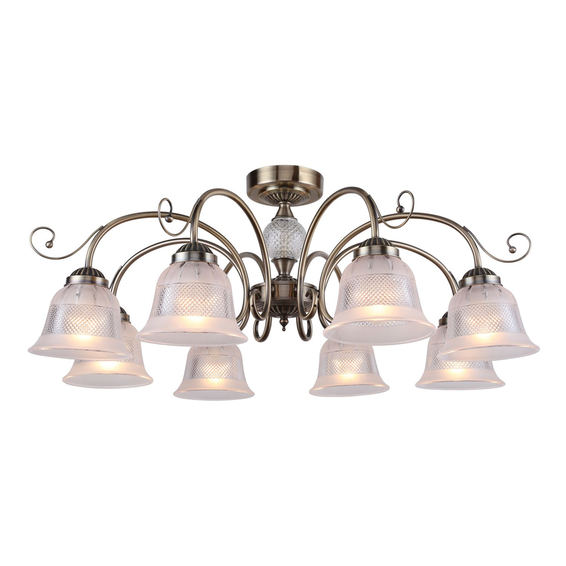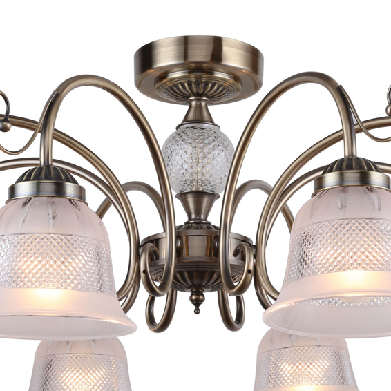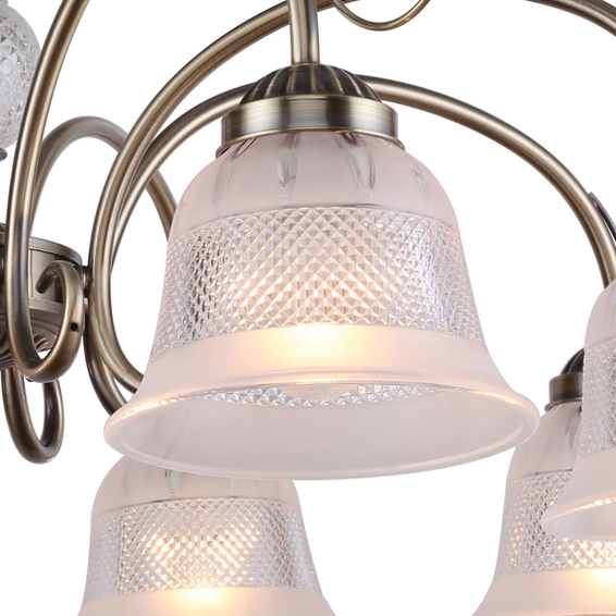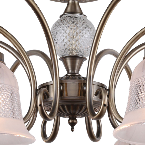 Каркас светильника из металла,окрашенный в антично-бронзовый цвет,дополнен стеклянным декором и полупрозрачными узорными плафонами.